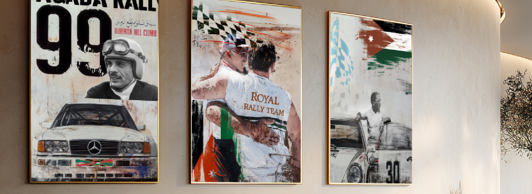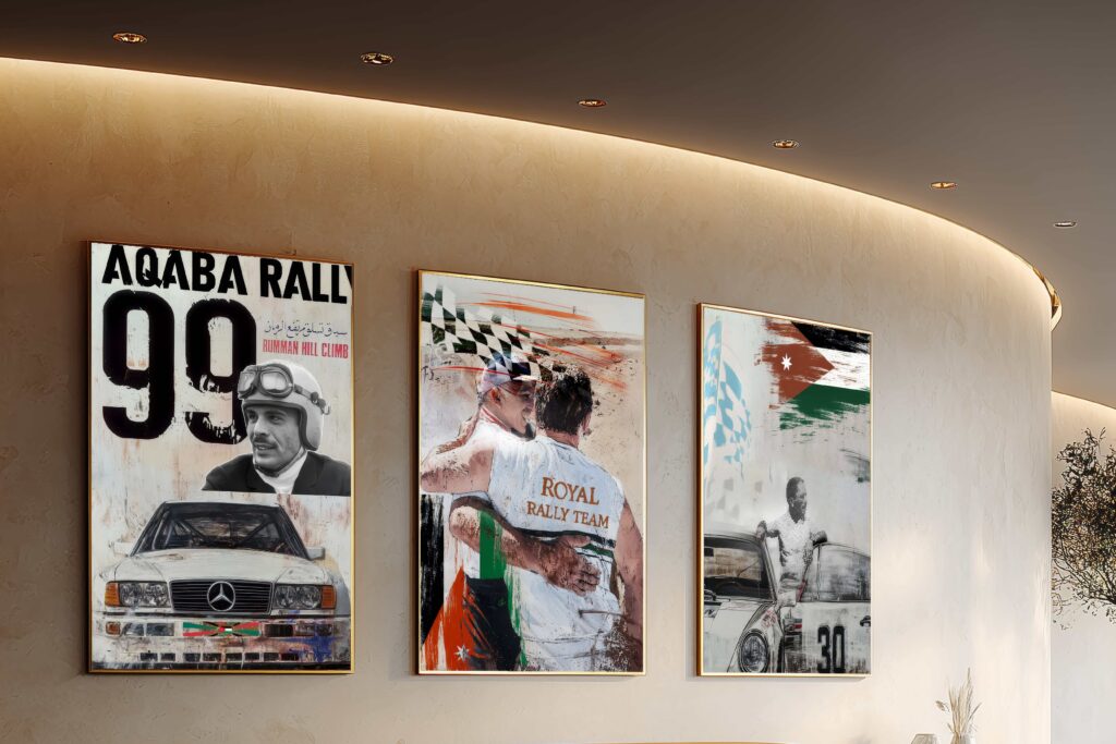 This collection captures the thrill, pride, and passion of King Hussein’s deep connection with motorsport in Jordan. Through bold strokes and striking imagery, the artworks celebrate iconic moments of rally racing from the roar of classic cars in Aqaba and the legendary Rumman Hill Climb, to the camaraderie of the Royal Rally Team and the enduring spirit of competition under the Jordanian flag. Each piece reflects not only the speed and intensity of the sport, but also King Hussein’s role as a symbol of unity, resilience, and national pride behind the wheel.