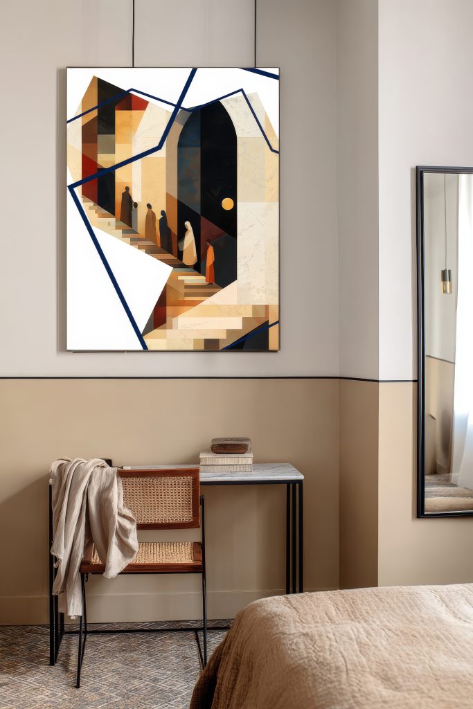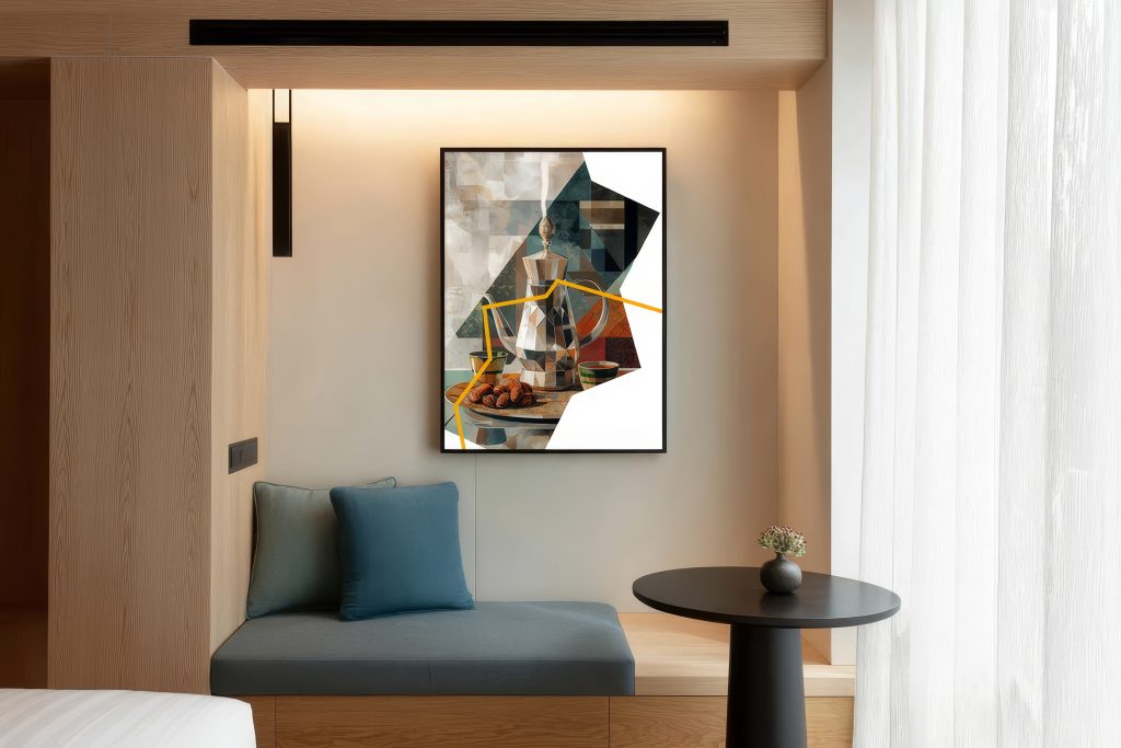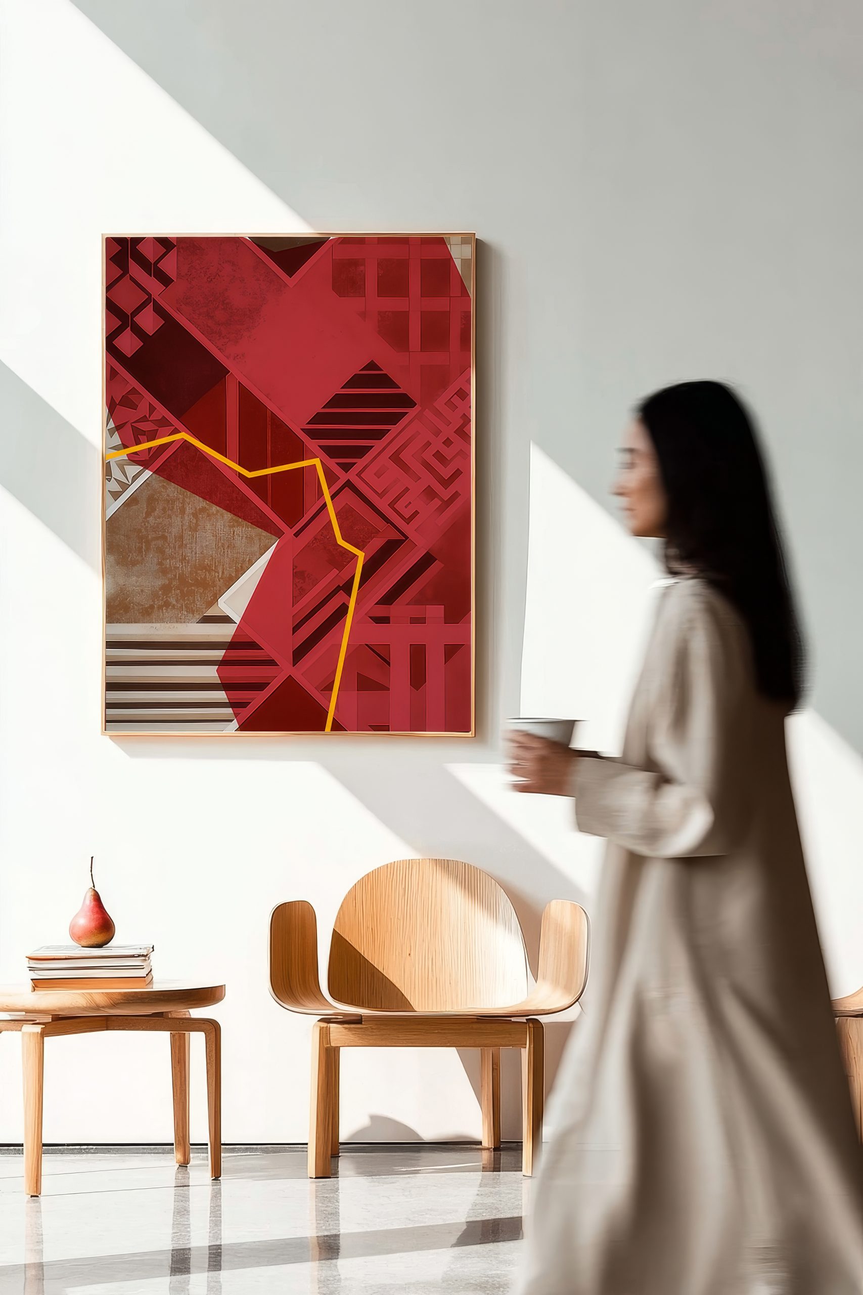 This collection draws from the richness of Saudi Arabian culture, weaving together symbols of tradition, hospitality, and identity. Through bold geometry, vibrant colors, and abstract forms, the works echo the warmth of coffee and dates, the elegance of traditional attire, and the spirit of gathering and connection. Each artwork becomes a bridge between past and present, carrying the essence of culture into a modern visual language.